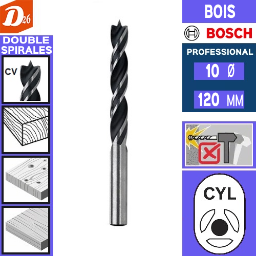BOSCH Professionnel Foret Mèche Hélicoïdale à "DOUBLE SPIRALE" Spécial Bois Dure/Tendre Ø 10mm Longueur 120mm pour Perceuses / Visseuses ROTATIVES – BOSCH Professional 2608596307