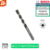 Caractéristique du BOSCH Professionnel Foret Multi-matériaux Pour Béton – Bois – Métal - Carrelage Ø 10mm Longueur 120mm pour Perceuses / Visseuses ROTATIVES et PERCUSSION – BOSCH Professional 2609255478 / 2608P00126 MultiMaterial