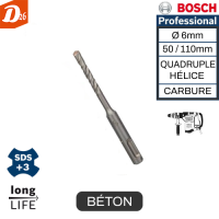 Caractéristique du BOSCH Professionnel Forets SDS-plus-3 Spécial Béton Ø 6mm Longueur 50/110mm "QUADRUPLE HÉLICE" pour Perforateur/Marteaux Burineur - BOSCH Professional 2608P00069 / 2608831007